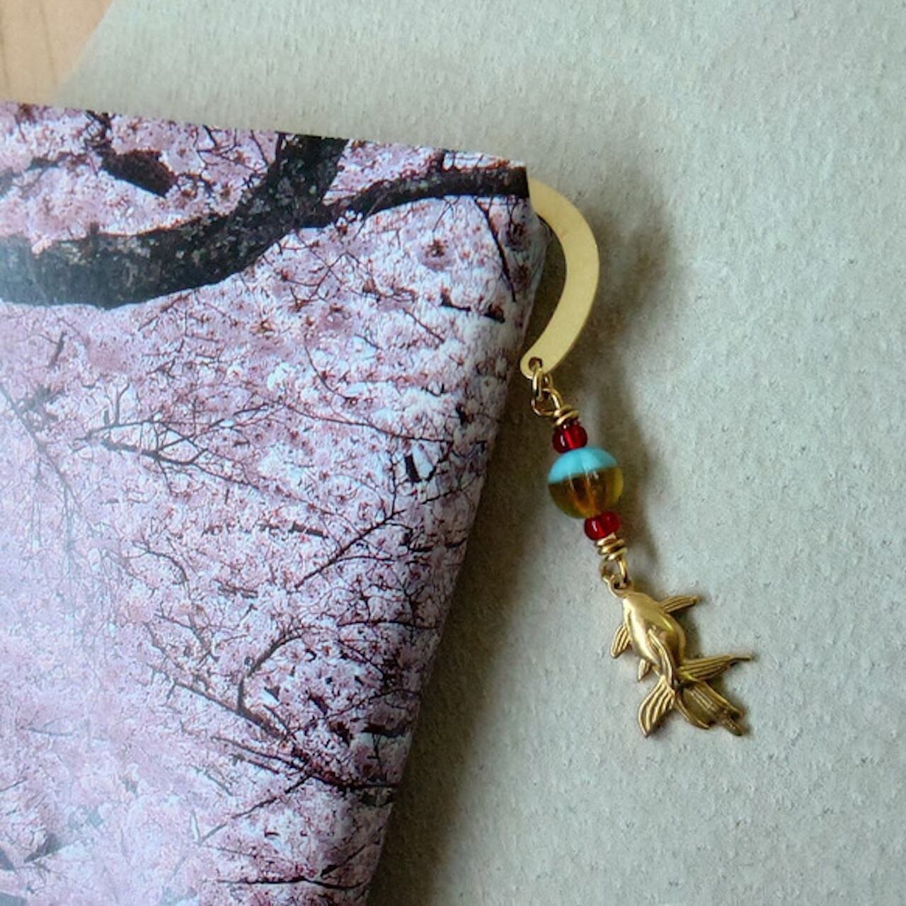 しっぽを丸めて本に引っ掛ける部分にし、先端にビーズと金魚のチャームを付けました。